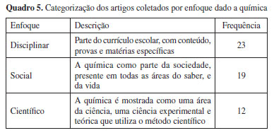 Investigamos também qual aspecto da química era retratado mais frequentemente ao longo do artigo, isto é, qual enfoque era dado. Para isso definimos três categorias gerais: Científico, Disciplinar e Social – descritas no Quadro 5. Novamente o aspecto escolar da química tem destaque, com mais pesquisas dedicadas a investigar as percepções ligadas ao conhecimento químico escolar do que o conhecimento científico.