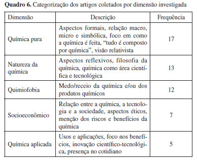 Fomos um pouco além, e avaliamos quais dimensões da química foram investigadas nos artigos coletados, de modo a mapear quais aspectos eram mais recorrentes. Assim, foram definidas seis categorias, baseadas no modelo apresentado por Christensson e Sjöström22 para análise de mídias sobre química, apresentadas no Quadro 6. Entre as dimensões mais investigadas observamos a “Química pura”, e a “Natureza da química”, ambos os enfoques trazem um olhar mais disciplinar da química. Mas, enquanto a “Química pura” aborda aspectos mais formais e pragmáticos, a “Natureza da química” traz aspectos mais reflexivos, um olhar mais crítico sobre a ciência química. A “Quimiofobia” também é fonte de interesse de alguns estudos que procuram entender/refletir sobre a visão negativa por parte do público sobre a química e/ou os produtos químicos. Já os enfoques voltados aos aspectos sociais da química, como sua aplicação no cotidiano e contexto histórico-sociocultural também foram pauta, ainda que menos recorrentes.