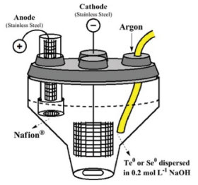 ![]() Figure 4. Two compartment electrochemical cell separated by a Nafion® membrane applied for the electrochemical synthesis of organochalcogenides. Reprinted with permission from Navarro and co-workers43 (copyright (2016) permission from Royal Society of Chemistry (RSC), all rights reserved)