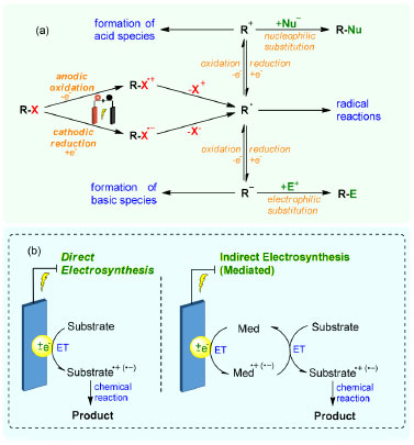 As a matter of fact, we are facing an era of scarce resources, excessive use of fossil energy, and a high level of pollution, which encourages researchers to seek the development and use of clean energy sources, including in the area of synthetic organic chemistry.14,15 As a consequence, there was a growing worldwide interest for the development of milder synthetic methods, such as the use of organic electrosynthesis to obtain organic molecules. Organic electrosynthesis is a powerful and sustainable method of conducting organic reactions, which has gained significant attention in recent years for its environmental benefits and synthetic efficiency.16-18 This innovative technique involves the use of electrical energy to drive chemical transformations of organic compounds. The mild reaction conditions are beneficial, allowing for easier handling of delicate functional groups and a broader range of substrates. By harnessing the principles of electrochemistry, it enables the construction of complex molecules with high selectivity and atom economy, paving the way for green and sustainable synthesis. Electrosynthesis allowed precise control of the reactions by adjusting the current and electrode potential, leading to the desired product with high accuracy. Moreover, it reduces energy requirements, making it environmentally friendly and cost-effective. Organic electrosynthesis can generate redox reagents on the spot from readily available materials, eliminating the need for complex pre-modifications. Unlike traditional methods that depend on costly pre-formed reagents, this approach provides enhanced reaction flexibility, facilitating chemical transformations in an efficient manner, enabling chemical transformations in an efficient pathway, often eliminating complex pre-modifications. Another advantages are the minimal waste produced, the selectivity, reproducibility, scalability under continuous flow conditions,19,20 and much more, aligning with many green chemistry principles.21 Organic reactions often involve the transfer of electrons between different species, which are referred to as redox processes. In a redox reaction, one species undergoes oxidation, losing electrons, while another species undergoes reduction, receiving electrons. Electrons are transferred from the species being oxidized (the reducing agent) to the species being reduced (the oxidizing agent). Reactions performed under electrochemical conditions are enabled by the application of an electric potential which allows a non-spontaneous electron-flow always using an electrochemical cell. Reaction mechanisms can occur in an electrochemical cell similar to reactions in conventional systems. However, in an electrochemical cell, electricity is used to boost reactions by applying a potential difference (electrical voltage) between two electrodes, an anode and a cathode. These reactions are by definition voltage-controlled and very specifically promoted. After the formation of oxidized or reduced intermediates via single electron transfer (SET), which can encompass a variety of species including radicals or formally charged molecules, different reaction pathways can be favored, promoting different transformations, such as functionalization, substitution, elimination, rearrangement, additions, or coupling reactions, among others (Scheme 1a). In general, there are two main types of reactions: direct reactions and mediated reactions (Scheme 1b). In direct reactions, the electron transfer occurs directly between the electrode and the organic substrate. The organic reagent itself accepts or donates electrons directly to the electrode. This is common in electrosynthesis when the organic substrate is easily oxidable or reduced. On the other hand, in mediated reactions, the electron transfer occurs through a redox mediator, which is a compound that accepts or donates electrons between the electrode and the organic reagent. The mediator acts as an intermediary in the electron transfer, allowing the reaction to proceed more efficiently. This is useful when the organic substrate is not directly electroactive.22-24