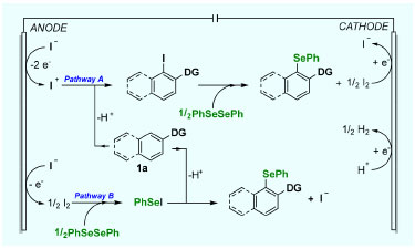 Two reaction pathways were considered (Scheme 4). In pathway A, the reaction initiates with the anodic oxidation of the iodide ion, resulting in the formation of the iodonium ion. Subsequently, electrophilic substitution occurs, which is quickly captured by the diselenide, leading to the formation of the final product and iodine. In pathway B, the reaction begins with the anodic oxidation of the iodide ion, giving rise to the iodine mediator. The diselenide undergoes oxidation, forming RSeI, which then attacks the activated arenes to generate the final product followed by the elimination of a proton and iodide ion.