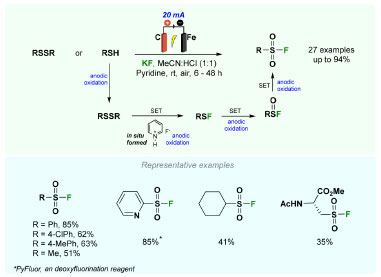 ![]() Scheme 5. Synthesis of sulfonyl fluoride through electrochemical oxidative coupling of thiols and potassium fluoride