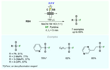 ![]() Scheme 6. Continuous-flow procedure for the electrochemical oxidative coupling of thiols and KF to synthesize sulfonyl fluorides