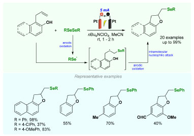Although existing literature for synthesizing selenide compounds through oxidative C-Se bond formation via C(sp2)-H bond activation in arenes, many of these methods involve the use of external oxidants or catalysts.65-72 In 2020, Braga and co-workers73 proposed an intramolecular electrochemical oxidative oxyseleno-cyclization of allylnaphthol and allylphenol derivatives without external oxidants (Scheme 9). This method demonstrates remarkable compatibility with diverse functional groups, resulting in the synthesis of a range of dihydrofurans containing organoselenium moieties. The successful conduction of a large-scale experiment was achieved, and a scope with total of 20 selenyl-dihydrofurans derivatives were obtained with yields of up to 99% using 0.2 equiv. of nBu4NClO4 as an electrolyte, MeCN as a solvent, and Pt working electrodes in an undivided cell. Interestingly, the reaction failed to deliver products when performed with KI salts. Considering the results of the control reactions, such as the complete inhibition of transformation with a radical scavenger 2,2,6,6-tetramethylpiperidine-N-oxyl (TEMPO), the authors believe that the reaction mechanism follows a radical pathway, albeit not ruling out a route involving the phenyl selenium cation. Additionally, several selenylated products have demonstrated comparable inhibitory activity against the enzyme acetylcholinesterase (AChE) using galanthamine as model, a commercially available drug applied as Alzheimer's disease treatment.