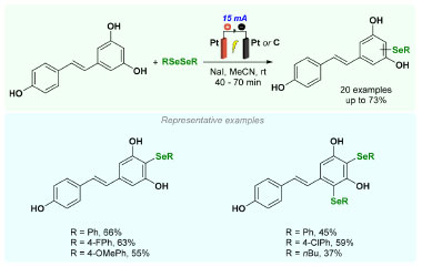 In 2021, Mendes and co-workers74 reported a protocol to achieve a regioselective electrochemical oxidative C(sp2)-H selenylation of resveratrol (Scheme 10), leading to the formation of unprecedented mono- and bisselenylated compounds involving a galvanostatic electrolysis utilizing platinum and graphite electrodes in an undivided cell. The method exhibited high efficiency under oxidant-free, base-free, and transition metal-free conditions, all performed in an open system at ambient temperature. Notably, this strategy required a sub-stoichiometric quantity of NaI, serving as both an electrolyte and mediator. The method demonstrated good functional group compatibility and proved effective for allylic diselenide derivatives, usually problematic substrates in this type of transformation, delivering products in yields of up to 73%.