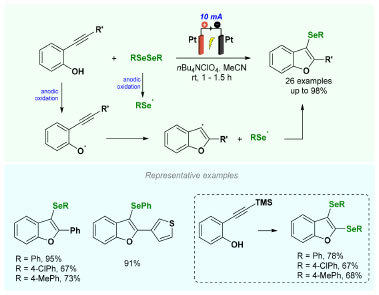 Braga and co-workers83 also developed a regioselective electrochemical synthesis of selenylbenzo[b]furan derivatives via cyclization of 2-alkynylphenols (Scheme 12). By a galvanostatic electrolysis, platinum electrodes in an undivided cell under oxidant-free, base-free, and transition metal-free conditions in an open system at ambient temperature delivered products in up to 98% yield. A gram-scale synthesis was achieved through cyclization of 2-(phenylethynyl)phenol with diphenyl diselenide. The reaction was conducted for 20 h, resulting in a 45% yield of the desired product. Interestingly, the use of 2-[(trimethylsilyl)ethynyl]phenol afforded the bis-selenylated product. According to control reactions, the reaction mechanism suggests a radical pathway, similarly as proposed above.