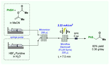 ![]() Scheme 14. Electrochemical synthesis of α-sulfenylated ketones in flow conditions