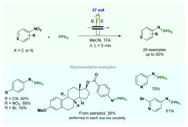 Recently, Noël and co-workers90 developed a novel electrochemical technique for the synthesis of aryliminophosphoranes. The key innovation of this method is its utilization in a continuous-flow system, which enhances efficiency and convenience (Scheme 16). A mixture of trifluoroacetic acid (TFA) (50 mol%), PPh3 (3.5 equiv.), nitro(hetero)arenes (1.0 equiv.), and MeCN (0.05 M) as the solvent provided products with yields of up to 92%. The method allowed the synthesis of aryliminophosphoranes without the need for additional supporting electrolytes. The transformation was conducted in a flow electrochemical reactor equipped with two graphite electrodes operated in a galvanostatic cell in a residence time of 5 min, and exhibited tolerance towards functional groups, especially electron-deficient nitroarenes. The experiment was scaled-up over 15.2 h, resulting in 4.1 g of product (79% yield - productivity rate of 6.45 g per day). In addition, the versatility of the aryliminophosphoranes is demonstrated as intermediaries to synthesize anilines, amines and amides. From respective aryliminophosphorane, a telescoped-flow method has been developed applying a tube-in-tube reactor charged with CO2 for in situ production of isocyanate. The isocyanate was then transformed into amide through the coupling with TFA. In contrast to literature, this methodology notably eliminates the need for potentially hazardous reagents, such as azides and molecular bromine, even when conducted at room temperature. Furthermore, it enabled a scale-up reaction without the need for additional electrolyte.