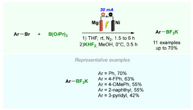 ![]() Scheme 18. Electrochemical synthesis of potassium aryltrifluoroborates using Mg0 as sacrificial electrode