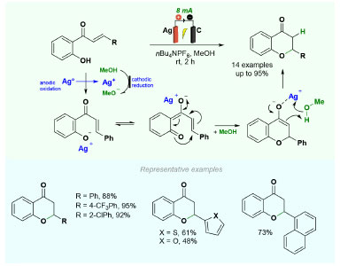 ![]() Scheme 19. Electrosynthesis of flavanones via oxa-Michael addition using Ag0 as sacrificial electrode