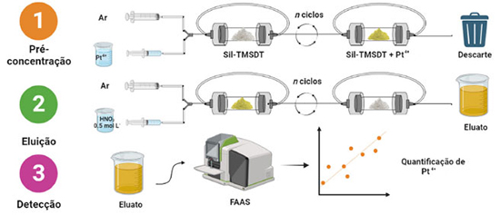 ![]() Figura 1. Esquema mostrando as etapas do processo de pré-concentração de íons Pt4+ e determinação via FAAS