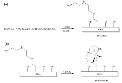 ![]() Figura 2. Reação proposta para a formação da rede de sílica organofuncionalizada (a) e para a interação entre Sil-TMSDT e os íons Pt4+ no sistema de pré-concentração (b)