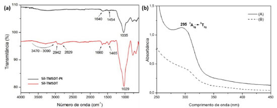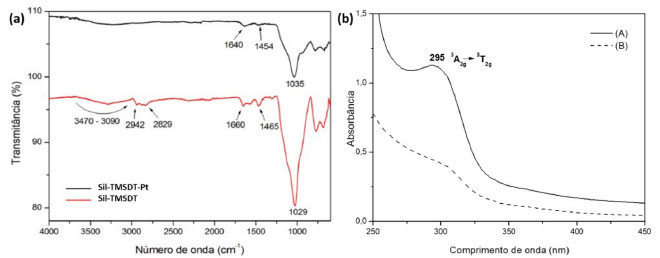![]() Figura 3. (a) Espectros de FTIR do Sil-TMSDT (em vermelho) e do Sil-TMSDT-Pt (em preto) e (b) espectros de absorção eletrônica da solução de K2[PtCl6] 10-4 mol L-1 antes (A) e após (B) a adsorção na coluna de pré-concentração