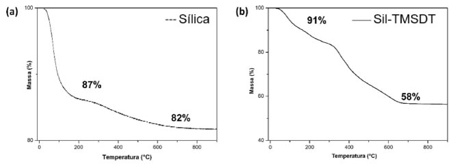 ![]() Figura 4. Curvas de TG das amostras de sílica (a) e Sil-TMSDT (b), a 10 ºC min-1 e vazão de ar sintético de 50 mL min-1