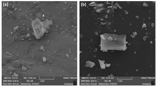 ![]() Figura 5. Micrografias de MEV de superfície das amostras (a) sílica e (b) Sil-TMSDT