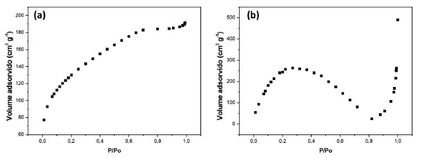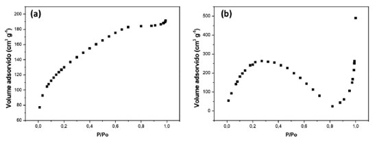 A partir das micrografias de MEV na Figura 5a, observa-se que a amostra de referência da sílica apresenta uma ampla distribuição granulométrica, partículas com formas irregulares, característica de materiais amorfos.35 A imagem dessa amostra exibe blocos com tamanhos menores que 5 µm. Observa-se que a amostra Sil-TMSDT (Figura 5b) também possui uma ampla distribuição granulométrica, no entanto, com formas mais regulares. Embora não tenha sido possível observar diferenças significativas na morfologia das estruturas, foi possível verificar, via EDS (ver Material Suplementar) a presença de nitrogênio na sílica modificada. Sendo este elemento, proveniente do sililante utilizado, confirmando assim, o processo de organofuncionalização da sílica. Na Figura 6 são apresentadas as isotermas de adsorção de N2 das amostras de sílica e Sil-TMSDT.