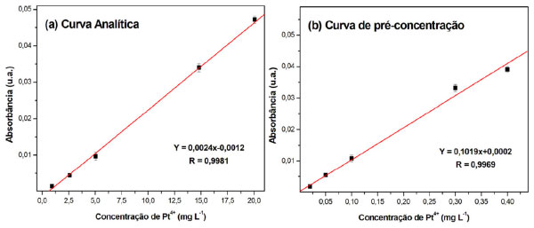 ![]() Figura 7. (a) Curva analítica construída com os padrões internos de Pt4+ e (b) curva de pré-concentração após a passagem dos padrões diluídos pela Sil-TMSDT