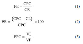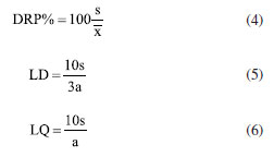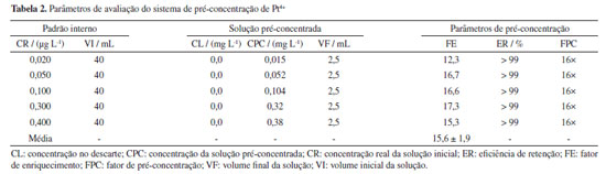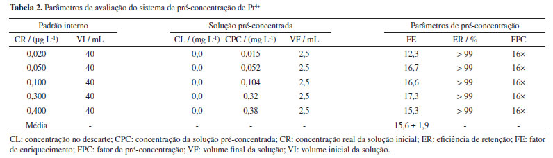 O fator de enriquecimento (FE) é o parâmetro mais utilizado para avaliar sistemas de pré-concentração e é definido como sendo a razão entre a concentração da solução do analito pré-concentrado (CPC) e a concentração real (CR) da solução de analito usada para a pré-concentração (Equação 1).26 A eficiência de retenção (ER) avalia a percentagem do analito que está sendo adsorvido pelo material adsorvente.27 A ER é definida pelo percentual referente a razão da diferença entre a CPC e a concentração do analito quantificada no descarte (CL) e a CPC (Equação 2). O fator de pré-concentração (FPC) é definido como sendo a razão entre o volume da amostra inicial (VI) utilizado na pré-concentração e o volume final (VF) do concentrado, que é o volume do eluente (Equação 3).26 ![]() Tratamento de dados Os parâmetros estatísticos do trabalho foram avaliados de acordo com as especificações do guia para validação de métodos analíticos da Agência Nacional de Vigilância Sanitária (ANVISA)28 e do Instituto Nacional de Metrologia, Qualidade e Tecnologia (INMETRO).29 A precisão dos ensaios foi calculada através do desvio padrão relativo percentual (DPR%) de 30 medidas consecutivas da solução de referência com concentração de 100 mg L-1 de Pt4+ (Equação 4). O DPR% é o resultado da razão entre o desvio padrão (s) do ponto em relação à média (x-) dos pontos. O parâmetro de exatidão foi realizado com o objetivo de obter concordância entre os resultados encontrados com um valor de referência. Nesse estudo, a exatidão foi evidenciada por meio de um valor de referência certificado e conhecido. Os limites de detecção (LD) e quantificação (LQ) são baseados na relação entre a sensibilidade da curva analítica (a) e o desvio padrão (s) em relação ao menor ponto da curva (Equações 5 e 6). ![]()