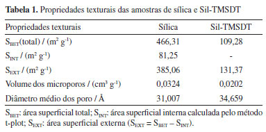 A isoterma de adsorção de N2 (Figura 6b) mostrou que o Sil-TMSDT exibe padrão de isoterma do tipo II, característica de materiais de intervalo mesoporosos a macroporosos, diferentemente do seu precursor sílica que apresentou um padrão de isoterma do tipo I (Figura 6a), característico de materiais microporosos.23 A Tabela 1 apresenta os valores da área superficial (total, interna e externa), volume de poro e diâmetro médio de poro das amostras de sílica e da Sil-TMSDT.