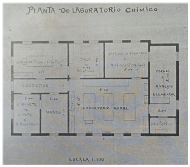 ![]() Figura 1. Planta do "Laboratorio de Analyses Chimicas" de Minas Gerais. Alfred Schaeffer montou e chefiou este laboratório desde a sua criação, em 1911, até 1917 (fonte: Álbum Médico de Belo Horizonte, 1912)11