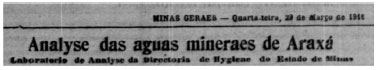 ![]() Figura 9. Recorte do periódico Minas Geraes, de 29 de março de 1916. Nesta publicação, Schaeffer apresenta os resultados da análise de fontes de água mineral da região do Barreiro, em Araxá (MG), classificando-as como "água mineral, fortemente alcalina, sulfurosa, sulfatada, thermal e radioactiva".20 Neste local, conhecido como "Complexo do Barreiro", foi construída, na década de 1940, uma das mais luxuosas estâncias hidrominerais do país21