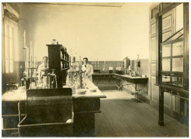 ![]() Figura 2. Alfred Schaeffer (o segundo, da esquerda para a direita) e seus assistentes no Laboratório de Análises Químicas de Minas Gerais, na recéminaugurada capital do Estado, Belo Horizonte. Década de 1910 (fonte: acervo Yara Schaeffer Novelli)
