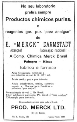 ![]() Figura 14. "Os produtos Merck" com "fabricação nacional em Palmyra, MG" sendo anunciados na Revista Brasileira de Chimica, em 1929 (fonte: Biblioteca do Departamento de Química da UFMG)46