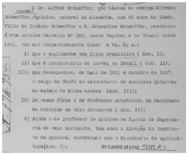![]() Figura 15. Parte do documento referente ao processo de naturalização de Alfred Schaeffer em 1934. Não há menção a sua atuação profissional na Merck desde o ano de 1923 (fonte: Arquivo Nacional)48