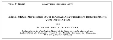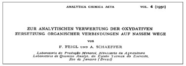 ![]() Figura 16. Frontispício de artigo de Fritz Feigl e Alfred Schaeffer publicado em 1950 em Anal. Chim. Acta (fonte: seção de Periódicos, Biblioteca Central, UFMG)
