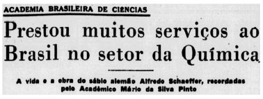 CONSIDERAÇÕES FINAIS Alfred Schaeffer foi membro da Academia Brasileira de Ciências (ABC) por 40 anos, desde 1917, quando a mesma ainda se chamava Sociedade Brasileira de Sciencias. Em junho de 1956, foi homenageado na sessão da ABC pelo 50o aniversário de sua tese de doutorado na Universidade de Munique, sendo ressaltada toda sua carreira científica, principalmente em Minas Gerais.50 Alfred Schaeffer manteve-se ativo com publicações científicas até bem próximo de seu falecimento, ocorrido em setembro de 1957, como por exemplo, a publicação intitulada "Separação Eletrolítica Quantitativa dos Sulfatos de Bário e Chumbo",51 presente nos Anais da Academia Brasileira de Ciências, de 30 de setembro de 1956. Na sessão da Academia Brasileira de Ciências de dezembro de 1957, em homenagem à memória dos acadêmicos falecidos no corrente ano, assim disse sobre Alfred Schaeffer, o então presidente da ABC, o médico Arthur Alexandre Moses (1886-1967):