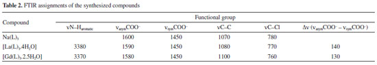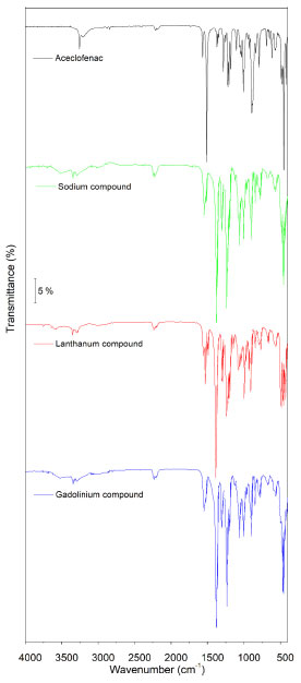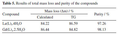 H2O: 0.0,327/0.082 = 3.9 ≈ 4 ∆ligand: 0.229/0.082 = 2.8 ≈ 3 Residue (1/2 La2O3) = 0.082/0.082 = 1.0 The following stoichiometry was found to the lanthanum complex: [La(L)3.4H2O], and gadolinium complex: [Gd(L)3.2.5H2O], where L represents the aceclofenac ligand. The total mass loss was calculated theoretically for both complexes and the values obtained are summarized in Table 5 together with the values calculated from the thermogravimetric data. From these data, it was also possible to estimate the purity level of these complexes (Table 5).
