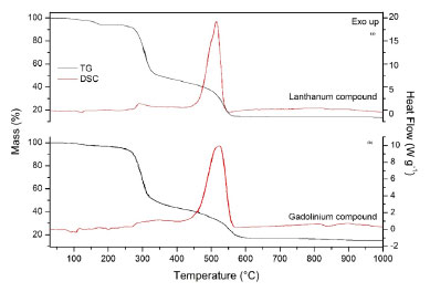 Thermoanalytical characterization of the lanthanum and gadolinium compounds The simultaneous TG-DSC curves of the trivalent lanthanum compound under an air atmosphere, obtained at a heating rate of 2 ºC min-1 are shown in Figure 2.