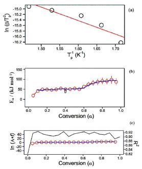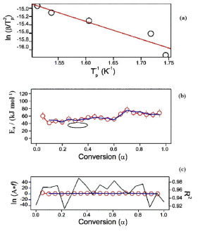 ![]() Figure 4. Kissinger plot (a), isoconversional plot of activation energy (b), and isoconvertional results (c) for the gadolinium compound