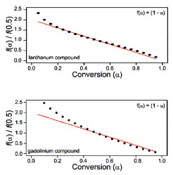 The activation energy values for the thermal decomposition of the compounds, obtained through the Kissinger method, were 40.51 ± 21.28 kJ mol-1 for the lanthanum compound and 35.45 ± 15.84 kJ mol-1 for the gadolinium compound. Model fitting (linear regression) The kinetic parameters estimated for the synthesized compounds by the model fitting method (linear regression) were calculated based on Equation 2.33 ![]() where α: reaction fraction; A: pre-exponential constant; Ea: activation energy; R: gas constant, equal to 8.3144 J mol−1 K−1; T: temperature. The correlation between f(α)/f(0.5) and the conversion estimated by the fitting model (linear regression) is shown in Figure 5.