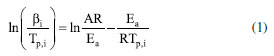 It is observed that the higher the heating rate, the greater the displacement of the curves and the lower the resolution of the steps. Therefore, one should work with heating rates as small as possible, thus avoiding highly displaced curves that lead to higher decomposition temperatures. Furthermore, the values of activation energy are significantly influenced by the fact that the decomposition of the compounds takes place in several overlapping stages. Table 6 presents the values of the activation energies calculated by the Kissinger method for each degree of conversion.