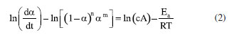 ![]() Figure 5. Correlation between f(α)/f(0.5) and the conversion estimated by the model fitting method
