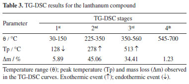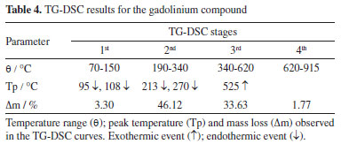 The first mass loss occurred between 30-140 ºC, corresponding to the endothermic peak at 128 ºC attributed to dehydration of the compound, resulting in a loss of 5.89% in mass associated with the removal of 4 H2O molecules. This step is followed by the thermal stability of the anhydrous compound, La(L)3, up to 188 ºC. Above this temperature, the TG curve suggests 3 steps of consecutive binder to lanthanum oxide formation. The second mass loss took place in the range of 225-350 ºC with a mass loss of 45.06%, corresponding to a small exothermic peak at 300 ºC. The third stage occurred between 350 and 560 ºC with a mass loss of 34.41%, corresponding to a large exothermic peak at 513 ºC, indicative of the oxidation of organic matter and/or the release of gaseous products during thermal decomposition. This process leads to the formation of carbonaceous and/or carbonate-derived residues. The first, second, and third stages of thermal decomposition of the lanthanum compound are consistent with the findings reported by Souza et al.14 The fourth stage occurred between 545 and 700 ºC, showing an observed mass loss of 1.23%, which can be attributed to the final oxidation temperature where organic matter and/or gaseous products that evolve during the thermal decomposition of the anhydrous compound. This process also coincides with the complete formation of the corresponding lanthanide oxide, as confirmed by X-ray diffractometry using the powder method. The La2O3 formed accounts for 13.41% of the mass of the compound. It should be noted that the stoichiometry of compounds will be discussed in more depth in "Stoichiometry of compounds" sub-section. The DSC curve does not show any evidence of endothermic (decomposition of carbonate derivatives) or exothermic events (oxidation of carbonized waste) associated with this mass loss. Probably the events occurred simultaneously, and the heat produced was not sufficient to be observed in the DSC curve, as has already been observed in other lanthanide compounds.14,18 Thermoanalytical characterization of gadolinium compound The simultaneous TG-DSC curves of the trivalent gadolinium compound under an air atmosphere, obtained at a heating rate of 2 ºC min-1, are shown in Figure 2. Mass loss occurs in four steps in the TG curve, and the endothermic and exothermic events are observed by the DSC curve. The results of the curves are presented in Table 4. A certain degree of similarity is observed between the curves of the La and Gd complexes, as observed in other trivalent lanthanide compounds.20