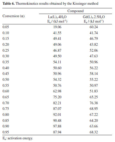 The model adopted for the analysis of the obtained data is based on the mechanisms of the type unimolecular decay law (instantaneous nucleation and unidimensional growth), where f(α) corresponds to 1 - a. Using the method adopted to calculate the kinetic parameters, an activation energy of 29.9 ± 2.7 kJ mol-1 was found for the lanthanum compound, and 37.2 ± 1.3 kJ mol-1 for the gadolinium compound.