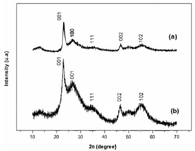 RESULTS AND DISCUSSION Characterization of the Nb2O5 samples Figure 1 shows the XRD patterns of the synthesized samples. Although the peak intensities were slightly different, the both samples showed similar diffractograms with broad diffractions peaks in 2θ equal to 22.8, 26.2, 34.7, 46.4 and 55.3º, indexed to the crystallographic planes (001), (100), (111), (002) and (102) of the tetragonal phase of Nb2O5 (JCPDS number 18-0911), respectively.30