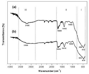 ![]() Figure 2. FTIR spectra of the samples: (a) Nb2O5-150; (b) Nb2O5-120