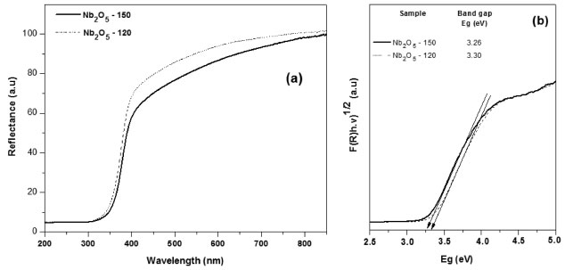 ![]() Figure 4. (a) UV-Vis diffuse reflectance spectra (DRS) of the Nb2O5 samples; (b) Tauc plot for the direct allowed transition obtained from DRS data (band gap values (Eg) are also shown in the inset)