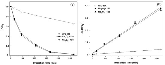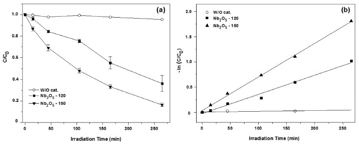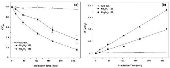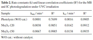 Additionally, Figure 1S (Supplementary Material) shows the zeta potential as a function of pH. These results demonstrate that both synthesized samples of Nb2O5 present a very low isoelectric point (IEP), and they are stable even under pH conditions higher than IEP. In this way, comparing the structural and morphological data of the two synthesized samples, it can be affirmed that the Nb2O5 was formed even at the lowest temperature of synthesis. Photocatalytic tests Methylene blue (MB) and indigo carmine (IC) dyes photodegradation The photoactivity of the synthesized Nb2O5 samples was first evaluated through the photodegradation of two different dyes: methylene blue (MB) and indigo carmine (IC). Firstly, it has been observed that there was a high adsorption of the MB molecules on the materials surface even in the dark before the photocatalytic test. This could be explained by the low IEP of the synthesized samples and by the cationic surface characteristics of the MB molecules, something that is not the case with the IC molecules.3,7,39 Figures 5a and 6a show the photocatalytic curves for the MB and IC photodegradation using as-synthesized Nb2O5 samples, respectively. Photodegradation curves were obtained by plotting the dye concentrations as a function of exposure time under UVC irradiation, where C0 is the initial dye concentration and C is the dye concentration at a specific time (t). The rate constants (k) were estimated using the pseudo-first-order model, which proved to be very appropriate (high linear correlation) for the both dyes.40 The fits are in Figures 5b (MB) and 6b (IC). Also, the values of k and the linear correlation coefficients (R2) are presented in Table 2.