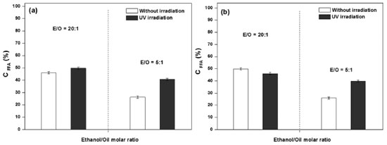 Figure 7. Effect of UV irradiation and ethanol/oil molar ratio on the reduction of AV: (a) Nb2O5-150; (b) Nb2O5-120