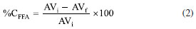 For the MB photodegradation (Figure 5a), the direct photolysis was negligible with a small reduction of about 5% even after 260 min under irradiation. Also, it was possible to observe a difference between the photodegradation efficiencies of the synthesized samples. The sample Nb2O5-150 (k = 0.0067 min-1 with almost 85% of removal efficiency) showed higher photoactivity than sample Nb2O5-120 (k = 0.0038 min-1) which presented approximately 60% of removal efficiency (Figure 2Sa, Supplementary Material). This result is probably related to the better interaction and higher adsorption of MB molecules on the surface of sample Nb2O5-150. Niobium pentoxide, which was a white powder, acquired an intense blue color after the adsorption of the cationic MB dye, whose adsorption was highest for sample Nb2O5-150. This absorptive property may correlate with the facile N2 adsorption on the surface area (SA) of 151 m2 g-1 (Table 1S and Figure 3S, Supplementary Material), enabling good exposure of active sites that had a positive effect on photoactivity. In contrast, the sample Nb2O5-120 presented an irregular N2 adsorption with a poor SA value of 9 m2 g-1. For the IC photodegradation (Figure 6a), the direct photolysis was nearly 30%, which demonstrated that IC molecules are more likely to degrade by direct photolysis under UVC irradiation than MB molecules. Also, the both synthesized Nb2O5 materials demonstrated excellent efficiency to remove IC dye, with approximately 100% removal efficiency (Figure 2Sb). The rate constants of the two samples were also very similar, showing values of 0.0142 and 0.0138 min-1 for the samples Nb2O5-120 and Nb2O5-150, respectively. Unlike the MB, no change was observed in the color of the Nb2O5 powders for the IC tests, indicating that the photodegradation probably takes place exclusively by radical attack on the IC molecules in solution without any adsorption. We compare the photocatalytic performance of the synthesized Nb2O5 samples in our present work with that of previously reported studies. The data are summarized in Tables 2S and 3S (Supplementary Material). The results from this work are superior to many others reported Nb2O5 catalysts for the photodegradation of dye wastewater. It is well known that photocatalysis with semiconductors occurs in two main ways: (i) by the direct transfer of electrons (e-) from adsorbed molecules on the semiconductor surface to the hole (h+) of the photoactivated semiconductor (in this case, Nb2O5 samples), forming unstable radical molecules of pollutant; (ii) by the formation of highly reactive radicals (mostly hydroxyl radicals) on the photocatalyst surface, which act on the molecules of pollutant (in this case, MB or IC), promoting its degradation.41,42 With this in mind, it can be concluded from the results presented here that the photocatalytic process for the MB was strongly influenced by the adsorption of their molecules. This process could be a simple adsorption (physical or chemical adsorption) or the above-cited process (i). On the other hand, the IC photodegradation was not affected by any adsorption, which leads us to believe that the IC degradation mainly occurred by typical photocatalysis, i.e., by the formation of highly reactive radicals (ii). The possible photodegradation products of MB and IC dyes were investigated using high-performance liquid chromatography (HPLC). These results are presented in Figures 4Sa (MB) and 4Sb (IC), in Supplementary Material. Based on the results obtained by HPLC, it was possible to observe the presence of photodegradation byproducts in reactions with both dyes, MB and IC. The MB dye was identified by a peak at a retention time of 1.02 min (first peak) from the chromatogram in Figure 4Sa. After the photocatalytic process with Nb2O5 samples, this peak has decreased clearly in comparison with the original peak of MB without degradation. Also, the formation of byproducts was observed with the appearance of peaks at different retention times between 3.6 and 4.6 min (other peaks in Figure 4Sa). However, it is important to note that MB was not completely converted after 260 min of reaction time. The IC dye was identified by a peak at a retention time of 1.06 min (first peak) from the chromatogram in Figure 4Sb. The IC dye, in turn, was probably completely degraded after 260 min of photodegradation. The formation of byproducts was observed with peaks in retention times between 1.4 and 1.6 min (other peaks in Figure 4Sb). Thus, the results obtained by HPLC successfully confirmed the photodegradation process for both dyes, being that the process for the IC seems to be more effective than for MB, as already indicated by its high removal efficiency observed in Figure 2S. Considering that the IC molecules did not present significant adsorption on the photocatalyst surface, it can be concluded that the adsorption process was not essential to promoting photodegradation. Taking a step further, we can say that the photodegradation process without adsorption was more effective (IC dye degradation), which demonstrates the important role of the reactive radicals for the photodegradation of organic molecules using semiconductors.41,42 Reduction of the free fatty acids (FFA) from waste cooking oil (WCO) Non-catalytic photoesterification The acid value (AV) of the waste cooking oil (WCO) was 15.8 mg KOH g-1, corresponding to 7.9% of free fat acids (FFA) in the composition of WCO. The photoesterification tests were first performed without Nb2O5 (blank). This analysis is important since although the FFA are weak Brønsted acids, they are active catalysts for esterification, and autocatalytic activity is generally observed.43 Figure 5S (Supplementary Material) shows the effect of UVC irradiation on the non-catalytic photoesterification in different ethanol/oil molar ratios (E/O = 20:1 and 5:1). A non-catalytic reaction with FFA conversion (CFFA) of around 45% was observed using a 20:1 molar ratio. Also, the FFA co