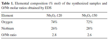 The images showed that the synthesized samples are composed of aggregate, and the particles do not have well-defined morphology. Also, it is not possible to observe significant changes in the morphology between the two synthesized samples. Additionally, the elemental compositions of both samples obtained by EDS (Table 1) were very similar, and the values of the O/Nb molar ratios were very close to those of the expected stoichiometry of the Nb2O5 (2.5).