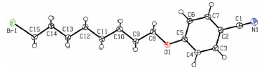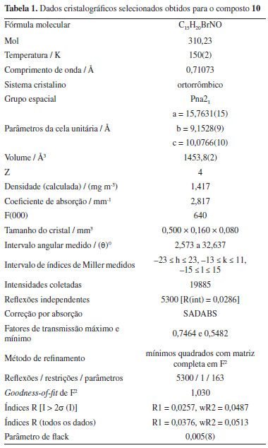 Propriedades físico-químicas dos compostos selecionados Uma quimioteca de 14 compostos, envolvendo isoxazolinas (1, 4, 5),21 isoxazóis (6, 7, 8, 9),22,23 tiazóis (3),24,25 tiazolinas (2, 11),24,25 4-(8-bromooctiloxi)fenilnitrila (10),25 e compostos azo (12, 13, 14),26 foi usada para o planejamento de misturas binárias com o propósito de estudar e validar o uso da equação Schröeder-van Laar para um conjunto de moléculas, das quais algumas delas são cristais líquidos. Além da validação da equação de Schröeder-van Laar, buscou-se identificar as misturas que mais se ajustavam à modelagem e que apresentaram a temperatura eutética mais baixa possível, e quando possível, com uma amplitude de mesofase maior do que dos constituintes individuais. Para o composto 4-(8-bromooctiloxi)fenilnitrila (10) foram coletados cristais da solução em etanol e analisado através da difração de raios-X em monocristal (DRX-MC). Os dados cristalinos mais importantes foram apresentados na Tabela 1, na sessão "Parte Experimental".