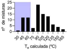 ![]() Figura 2. Distribuição dos valores de temperatura eutética das 91 misturas binárias planejadas. Os menores valores de temperatura eutética estão destacados em azul
