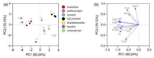 ![]() Figura 3. (a) Distribuição dos escores dos dois primeiros componentes para os compostos investigados de acordo com suas propriedades físico-químicas. (b) Diagrama dos vetores mostrando as correlações entre as variáveis investigadas