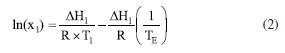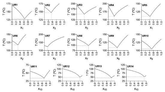 Os diagramas de fases calculados para as 14 misturas binárias estão mostrados na Figura 4. As curvas foram geradas ao plotar a Equação 2, usando os valores de temperatura de fusão e de variação de entalpia obtidos pela integração dos sinais dos perfis de calorimetria exploratória diferencial (DSC). Os valores de temperatura eutética encontrados na solução numérica dos sistemas de equações para cada mistura binária mostrados na Tabela 2, podem ser confirmados nas coordenadas dos pontos de inflexão para cada gráfico da Figura 4.