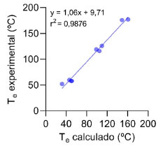 Avaliação do modelo Os valores encontrados para as temperaturas eutéticas das misturas por meio da análise dos perfis de calorimetria exploratória diferencial foram plotados em função dos valores calculados pela equação de Schröeder-van Laar (Figura 5). Pode ser observada uma forte correlação linear entre estas duas variáveis (r2 = 0,9876). A reta obtida por regressão linear apresenta grande proximidade com a reta ideal y = x, sendo que o coeficiente angular se aproxima de 1 (a = 1,06) e o coeficiente linear se aproxima de zero (b = 9,71). Para esta análise não foram consideradas as misturas em que houve a formação de um sistema heterogêneo (misturas 1, 3, 5, 6 e 7).